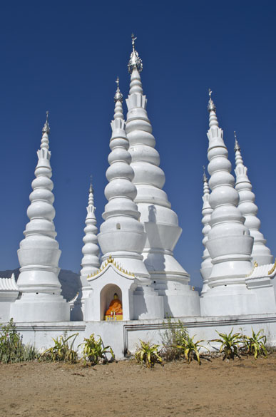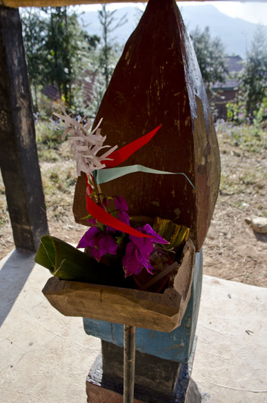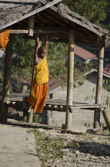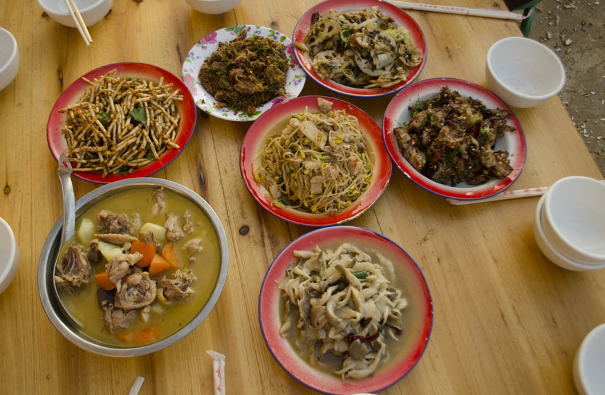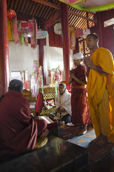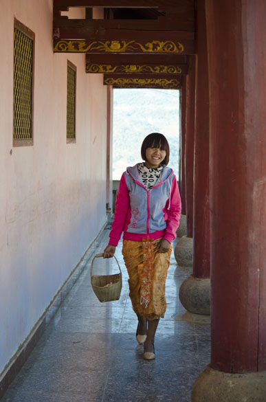 BenLao is a small border town in China sharing a border with Myanmar. It's a small remote village about 2 hours drive from Cangyuan. The town is on the border so much that I can see the mountains of Myanmar, as a local pointed out at the first dinner I enjoyed there. I take the mornings to eat breakfast, explore the weekly market, or do laundry in the hotel. One morning, I woke up and went to the local buddhist temple for a young boys initiation ceremony. They used local paper crafts and umbrellas were hanging from the ceiling to decorate the temple. One day, I went to the white stupa, which was really resplendent and beautiful with big white towers reaching into the clear blue sky. The temple resembled Myanmar temple construction with long spires and buddhas inside.