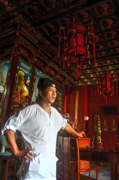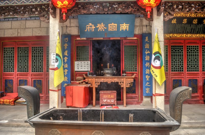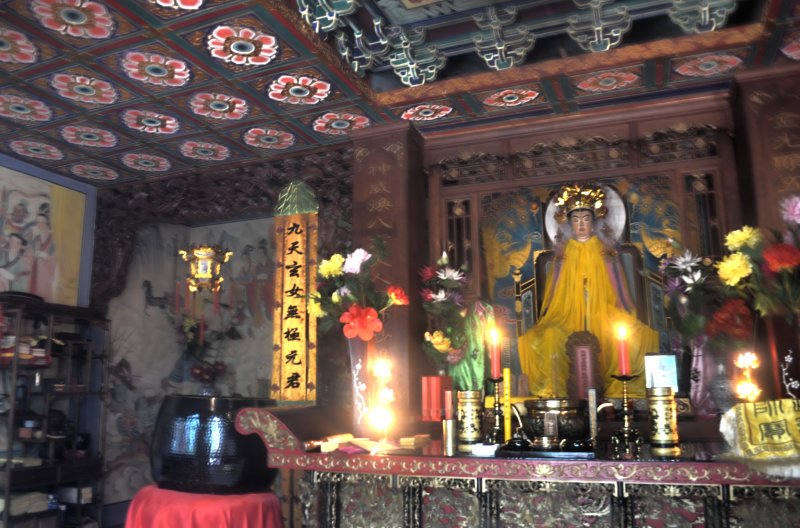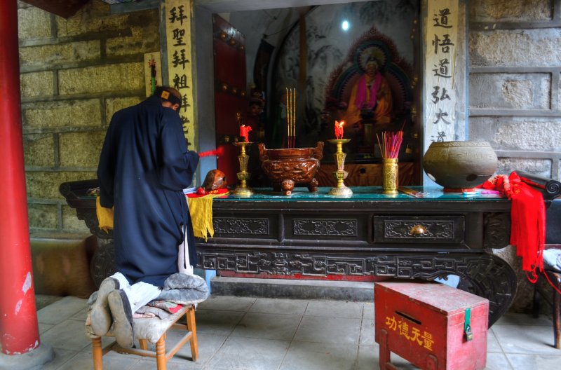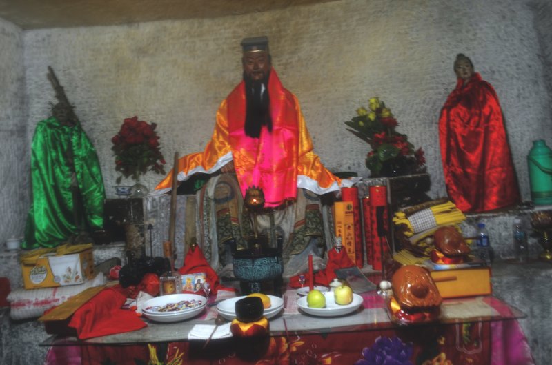 Finally we reached the bottom, and I was relieved. Afterwards I caught the shuttle back to the temple area, and arrived around 4pm thinking I was late for the ceremony. Luckily for me it really started at 4:30, so I got to have tea and chat with one of the monks who was there. He was trying to tell me about the deity statue that was there, and he was the founder of QuanZhen Taoism, or something about he was the one who started the Huashan branch of Daoism. I hadn’t seen the majority of the temple at that point. I rushed to the ceremony and the monks all arrived. I had never seen the Daoist chanting before. It was sweet. I took some photos and videos excited by the experience. Afterwards I wandered throughout the temple and noticed that the monks who were the guardians of the temples had similar appearances to the deities. I think the abbot of the temple does it on purpose. It was almost comical at certain temples how similar the priests or priestesses looked in comparison.