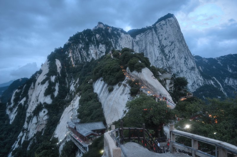 vPeople hike the mountain during all hours of the night and day. Students especially enjoy hiking at night and the entire trail is covered in lights. I took some photos at dusk and did some stretching and yoga on the deck. In the morning I returned to the same empty deck to watch the sunrise, while the others were all crowded on the main area. I was happy to have discovered such a secret place without others. The sunrise barely was visible because of cloud cover, so I went back to sleep for a few hours. I woke up and had breakfast in the restaurant for 25 kuai, and it was a simple dish of beans and celery and some soup, and a piece of mantou bread.