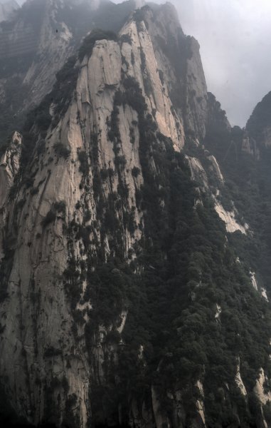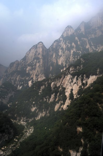 I started out on the hike to the east peak. This is the part most people climb because there is a cable car from the bottom to this north part of the peak. Most people then climb to the east peak. So it’s the main part of the complex, with many scenic areas to see and temples along the way. The first temple I visited was the dragon king temple, and I had never seen this particular deity before. Then there was a very steep area to climb for several hundred meters of stairs. There were chains on both sides hanging so the climbers could easily grasp the handles. I found myself wanting to turn around and take photos of the view, which got better and better until I reached the top and witnessed the view. It was incredible. Along the way a Chinese family grilled me with questions when they realized I was fluent in Chinese, and that’s always fun and annoying. I got to the top to the east peak and it had gotten very cloudy and overcast due to the weather. I felt again disappointed that I hadn’t started out a day earlier. The most spectacular views are seen from the top, and a lot of it was covered in fog. Regardless of that, the fog was gradually receding and I could still see a lot of the cliffs and steep desents. It was incredible and terrifying from the top. The cliffs are straight drop offs and looking down into the valleys below really brought me deeper into the Taoist philosophy and religion overall. I didn’t realize that height and hanging over the precipice was such an integral part of their sacred mountains. I enjoyed standing at certain spots and feeling as though I was free falling over the edge. The feeling was like flying and falling, but I was going no where. Certain spots seemed to pull me into a vortex from which I could barely move forward even a tiny bit. Overall, the place is very safe with plenty of hand holds and chains. There were parts of it where it required a bungee cable connected to the chain and a guide to go down further. I declined these parts of the mountain, unsure of the climb. I had my bags and wanted to head back sooner than later to ensure a timely arrival to the base of the mountain where the old Taoist Yuquan Jade spring temple was. They only held the afternoon ceremony there, and I wanted to be sure to see it. By the time I went to descend the mountain, it was perfect timing. I had taken my time wandering through the various temples and caves, seeing the deities. I wandered to the various lookouts and looked over the edge and snapped a few photos. Part of the novelty of being there were the wooden plank walks and being chained to a bungee cord. Since it had become increasingly overcast, I had given up on trying to feel the dropping. Instead, I got into the cable car from west peak back to the bottom. That was the most terrifying part of my entire trip. I felt like I had done something crazy and stupid by riding in a cheaply made Chinese cable car. I thought I was surely going to fall to my death with the others in the car. It was so high up, and we went over huge valleys off the mountain. I was scared for my life and so was the family in the car with me. The young girl was only about 6 and nearly started crying when the car stopped for a second because of the winds.