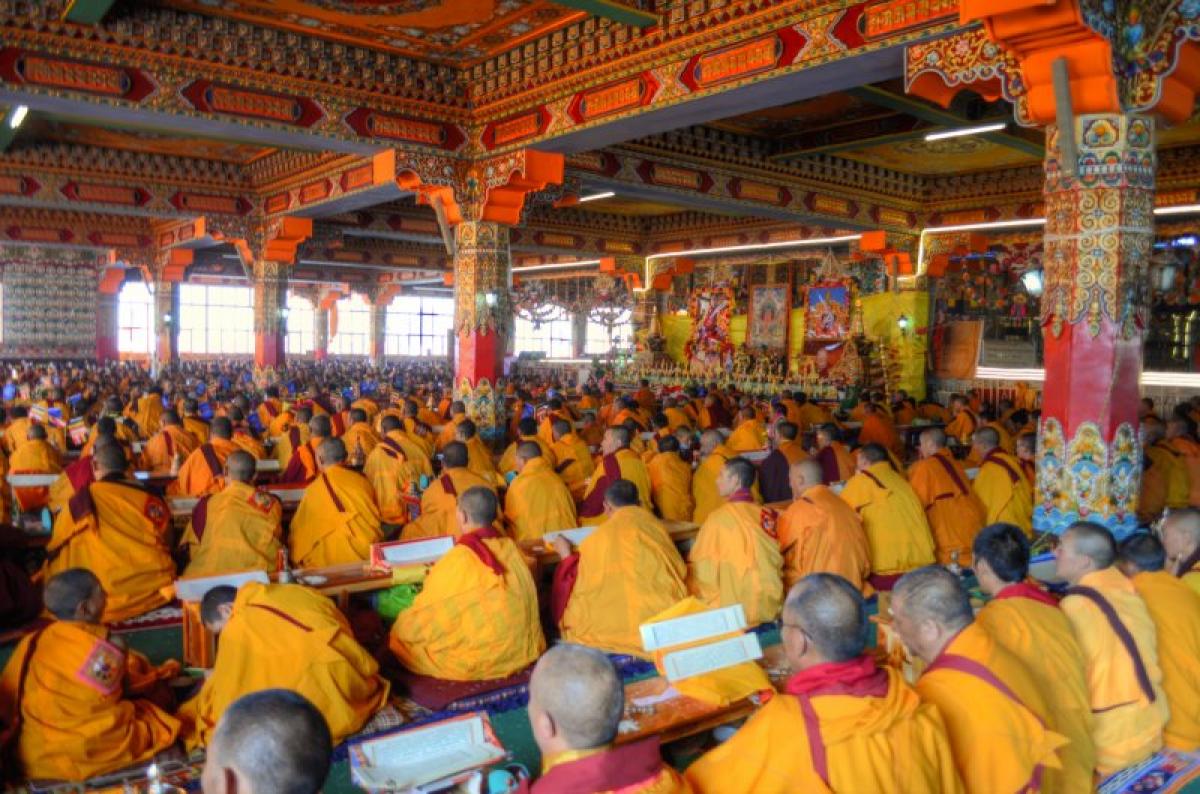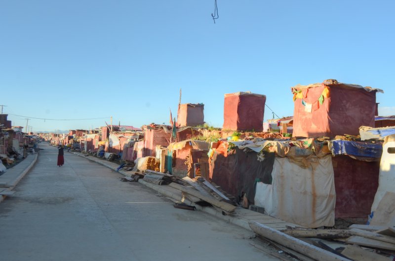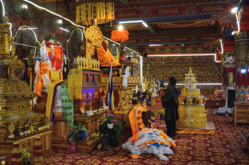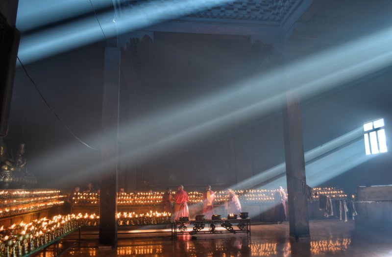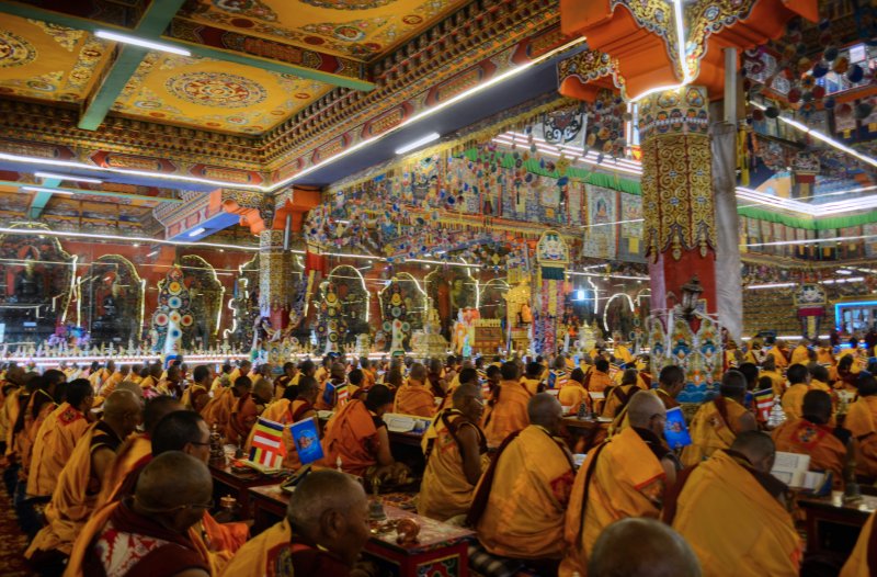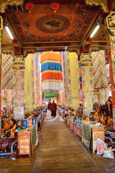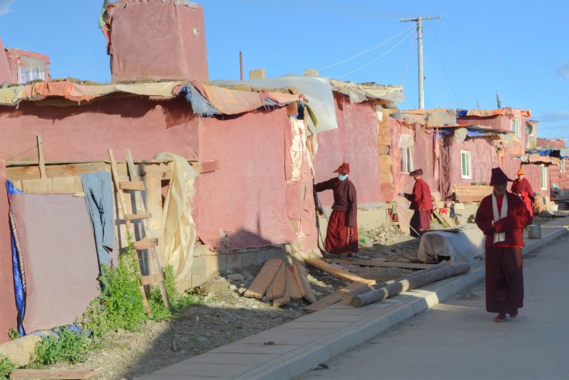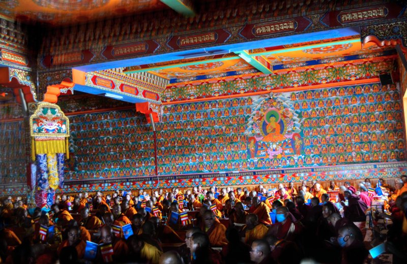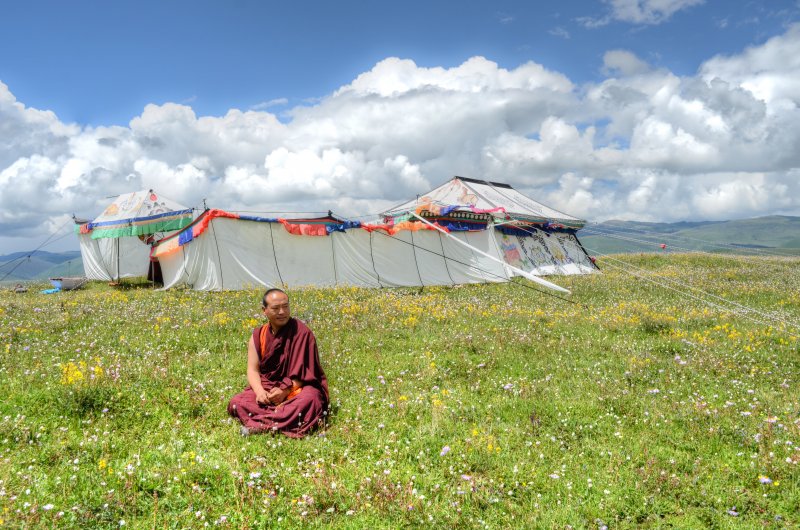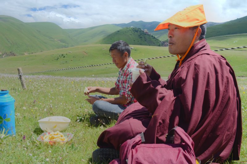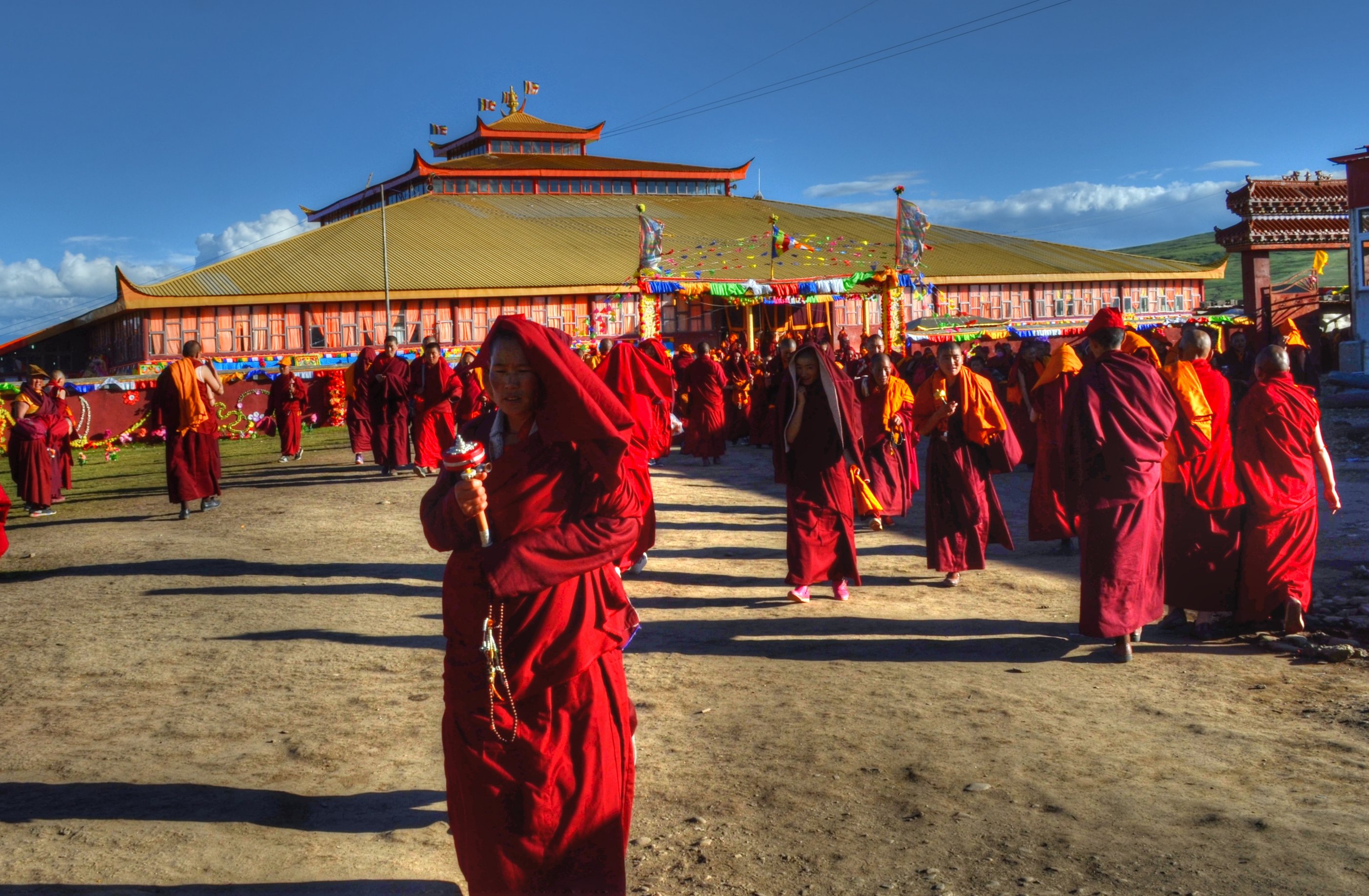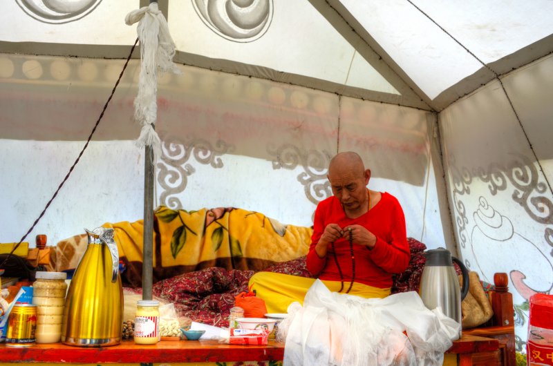 After I checked in, I headed to the main monestary again where I heard the chanting and I took photographs. The entire hall was full of monks. I had no idea what was going on or if this was a normal occurrence. They were all chanting in unison with the buddhas all over the walls. I watched them get served yogurt and tea, and then they arranged the small round things with the rice, fuck I forget what all of this stuff is called. I sat there for an hour or more with them while they chanted. It was truly incredible. Afterwards, I went to get some snacks and ended up getting some sweets from a handmade Chinese sweet shop. They were tasty. I walked over to the area with the nuns and as I arrived and sat down, shortly afterwards they all got up, so I followed them. They began to line up and there were a few ladies in the front with conch shells and the large reed instruments. They started walking, and lining up, all of the nuns came out of the temple together and threw on a yellow shawl. They started walking somewhere, and I had no idea where they were going. We walked around the field together with the oboes blaring. It was a big circle. There was a big festival happening for the death of a famous lama. So there were more than the usual people here. Afterwards I went to eat dinner and a nice Tibetan girl sat with me and ate dinner. Then I went to sleep. I woke up in the morning and went back to the temple and then to the nunnery. I sat with the nuns and they offered me some of their tea. I left and went to a temple where they were offering butter lamps. I ate some noodles for breakfast. I went and did some prayer wheels. I went back to the hostel for a moment and then decided to leave because they were burning plastic in the wood burning stove again. I had to get up so I left to explore some more buildings, and eventually got some baozi snacks and fried bread. After a while of resting then I took a long walk over to the neighboring village which was made in a rock quarry. They had a lot of rocks they were pounding into smaller piece with axes. I wanted to see the small temples up there, but it seems that it had disappeared once I got over there. I got a ride back to the temple. I walked to some of the temples that I hadn’t seen yet, like the lama’s temples and their paraphernalia. I walked to the top where guru Rinpoche was and watched the nuns circle around the grasslands from the hill above. I wanted to see the head lama of the temple speak and then I walked around until he started class. I attended class for a short while. Then I went to get a closer look at the main temple now that all of the people were gone. It was beautiful. There was still rice on the floor.. I tried to similarly see the nunnery but it was closed.