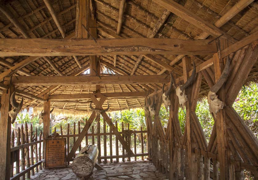 After eating, I further put on more clothes, as the climate here is cool and damp with chance of rain. There is a thin mist that covers everything. As we walk along the bamboo picket fences towards the trail to start our journey, we pass many fields with cows, ponies, and dogs. The small village on the edge of the nature reserve has many houses and about 300 residents nestled within the mountains covered by bamboo, and conifers. The village appears to be doubling in size in terms of houses. After walking for a half an hour, another man joins us for the ascent to GaoTianYan (高天岩), which means, high heaven rock. We begin walking in preparation for a long day. After several hours, we reach a crossroads to the Taoist temple, which is at the top of the mountain at around 1300m. I'm told we'll have lunch there, and one of the men takes that road to begin preparing. We still have several hours to place the cameras so I take off with the other man who guides me along a trail through the bamboo forests. The wet bamboo is blue, sagging with rainwater, amist deciduous trees with no leaves. It's in this area that the man I'm walking with tells me that he's 75 years old, although I would have guessed he was 60. Later in the day, I find him quite whiny when he wants to place the camera traps too close to each other, and I can tell he likes to get his way. I can barely understand what he says because he slurs a lot while talking. Chinese language is difficult enough to understand, and thankfully nothing we have to talk about is that important. He usually can finally simplify enough that I can understand. I'm also challenged with speaking Chinese, although I'm told I sound very good. This area reminds me of coastal California, where I was living before moving to China. The climate and tree types are similar. We place the three cameras after crawling along trails and through the mountains.